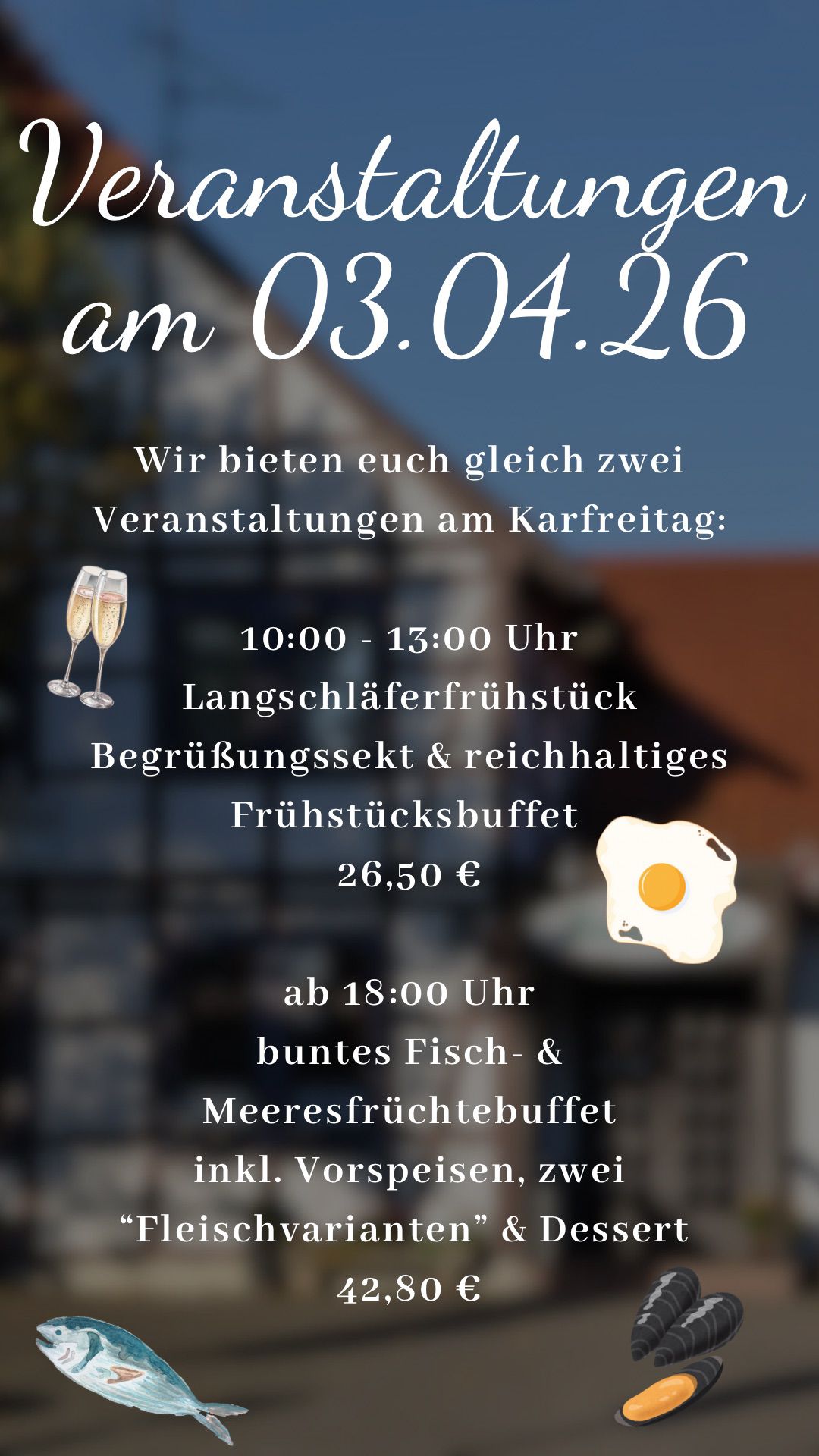 | Freitag und Samstag ab 17:00 Uhr Küche ab 17:30 Uhr |