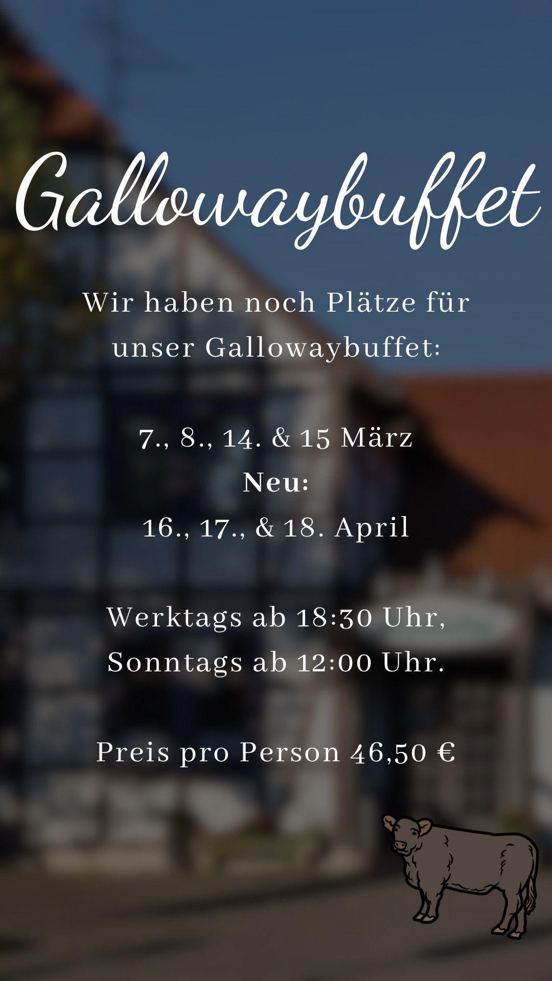| Montag bis Mittwoch ab 17:00 Uhr Küche ab 17:30 Uhr |